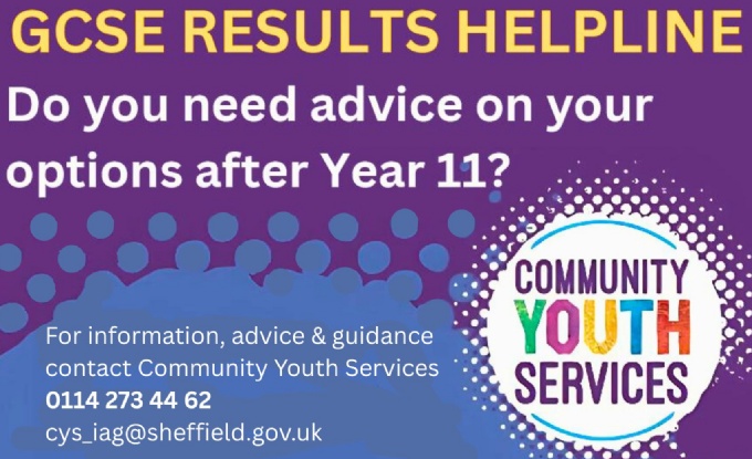 Y11s - on GCSE results day you can get support in school from staff, including the careers adviser, but if you need support you can also contact the Sheffield GCSE results helpline open 1pm to 5pm Monday to Friday normally and extended hours of 8.30am to 5pm on GCSE results day and the following day (21st and 22nd August).