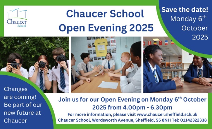 Chaucer warmly invites all parents / carers of children in primary schools to our annual Open Evening. Taking place on Monday 6th October 2025 from 4pm - 6.30pm.
